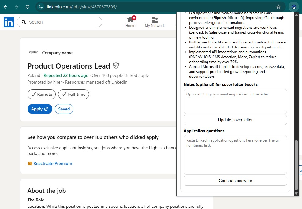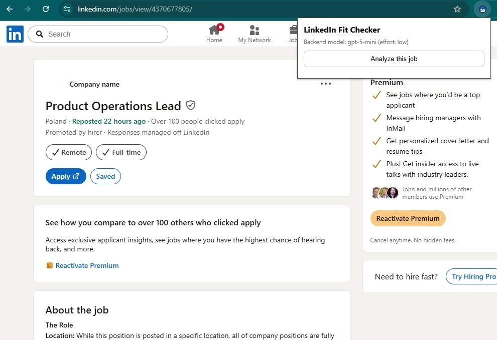 If opened on a LinkedIn job posting, it will provide the option to analyse the position